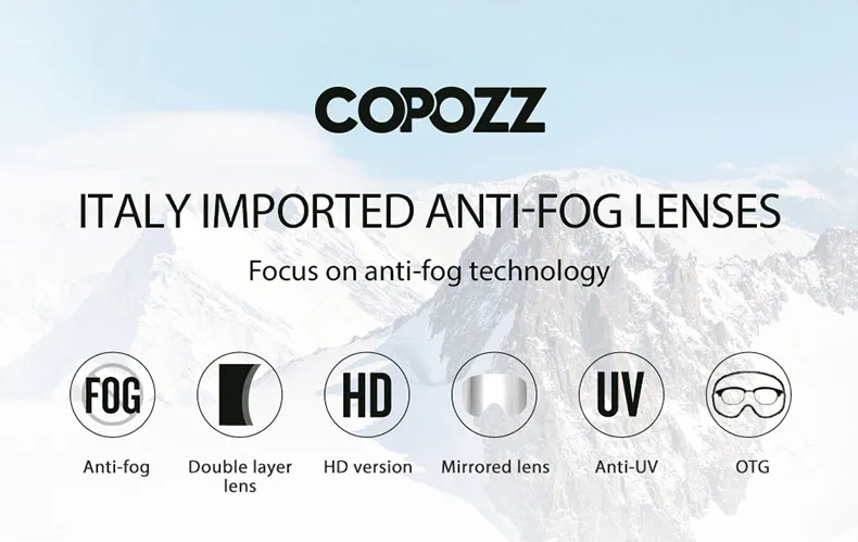 Due to the strong sunlight, reflected light from snow mountain and cold wind that stimulate the eyes, we suggest you choose a security professional ski goggles while the brand "COPOZZ" is your best choice. COPOZZ ski goggle is more fit for your face and can prevent your eyes from the heavy wind. The lens is made from imported material and its mirrored coating is hardened, scratch-resistant and abrasion-proof. The goggles are 100% Anti-UV, play a key role in eyes protection